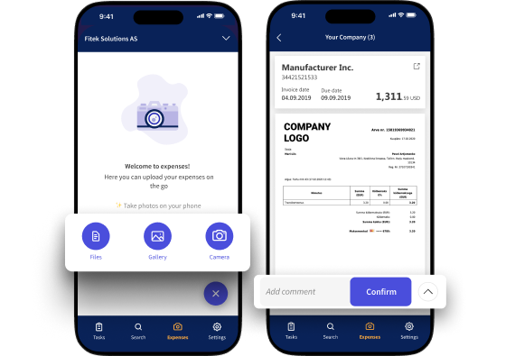 Saisissez vos reçus, classez vos dépenses et gardez le contrôle de vos finances directement depuis votre téléphone. Avec l'application mobile de FitekIN, vous pouvez gérer vos dépenses en déplacement et ne plus jamais perdre un reçu.